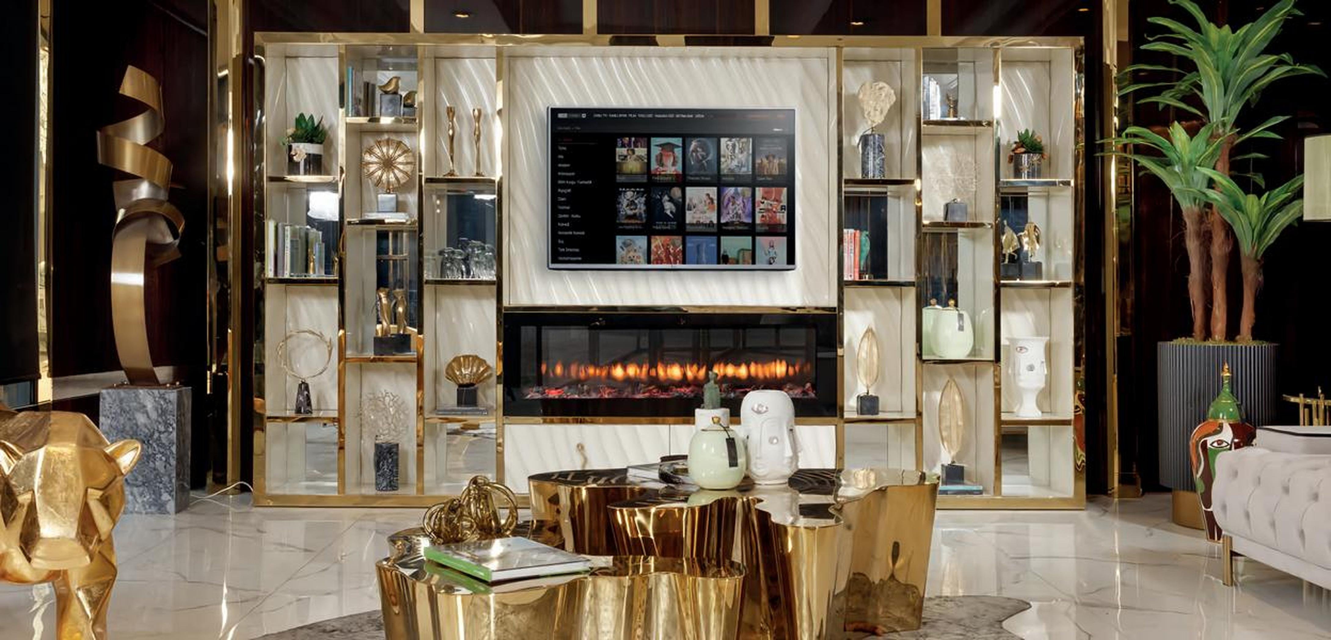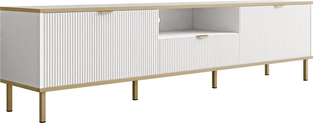 Meuble tv design contemporain 2 portes effet cannelé 2 niches piètement poignées métal doré mdf noir
