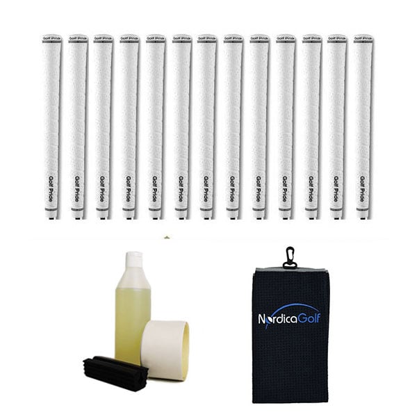 Golf Pride Tour Wrap 2G White - kit de 13 grips, caoutchouc pour étau, solvant, adhésif et serviette.