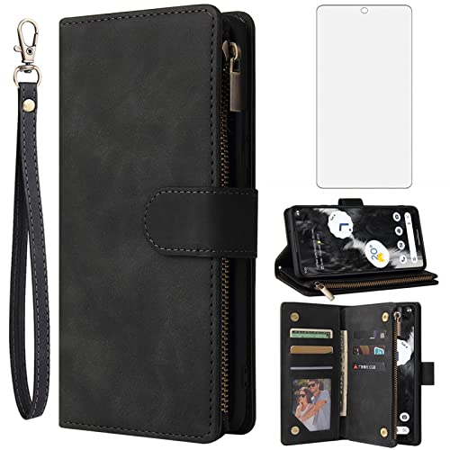 Asuwish Coque pour Google Pixel 7 Pro Portefeuille avec Verre Trempé et Porte Carte Chaine PU Cuir à Clapet Étui Housse Support Pixel7Pro 7Pro 5G Sieben Protection Téléphone Case Femme Homme Noir