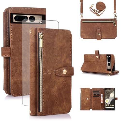 Asuwish Coque pour Google Pixel 7 Pro Portefeuille avec Verre Trempé et Cordon Porte Carte Chaine PU Cuir à Clapet Étui Housse Support Pixel7Pro 7Pro 5G Sieben Téléphone Case Vitre Ecran Femme Marron