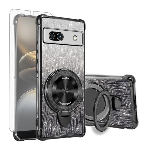 Asuwish Coque de protection pour Google Pixel 7a - Compatible avec MagSafe - Film de protection en verre magnétique - Anneau de support - Pixel7a 5G a7 - Fine - Paillettes - Noir