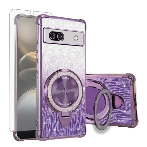 Asuwish Coque de protection pour Google Pixel 7a - Compatible avec MagSafe - Film de protection en verre magnétique - Anneau de support - Pixel7a 5G a7 - Paillettes - Violet