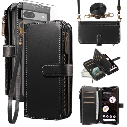 Asuwish Coque pour Google Pixel 7a Portefeuille avec Verre Trempé et Cordon Porte Carte Chaine PU Cuir à Clapet Étui Housse Support Pixel7a 5G a7 Téléphone Case Vitre Protection Protege Femme Noir