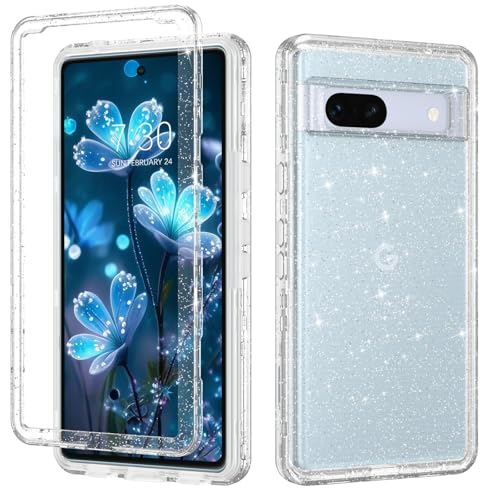 DUEDUE for Google Pixel 7a Phone Case, Glitter Bling Sparkle 3 in 1 Heavy Duty Cover Hybrid Hard PC Rugged Shockproof Transparent Protective Phone Case for Pixel 7a, Clear