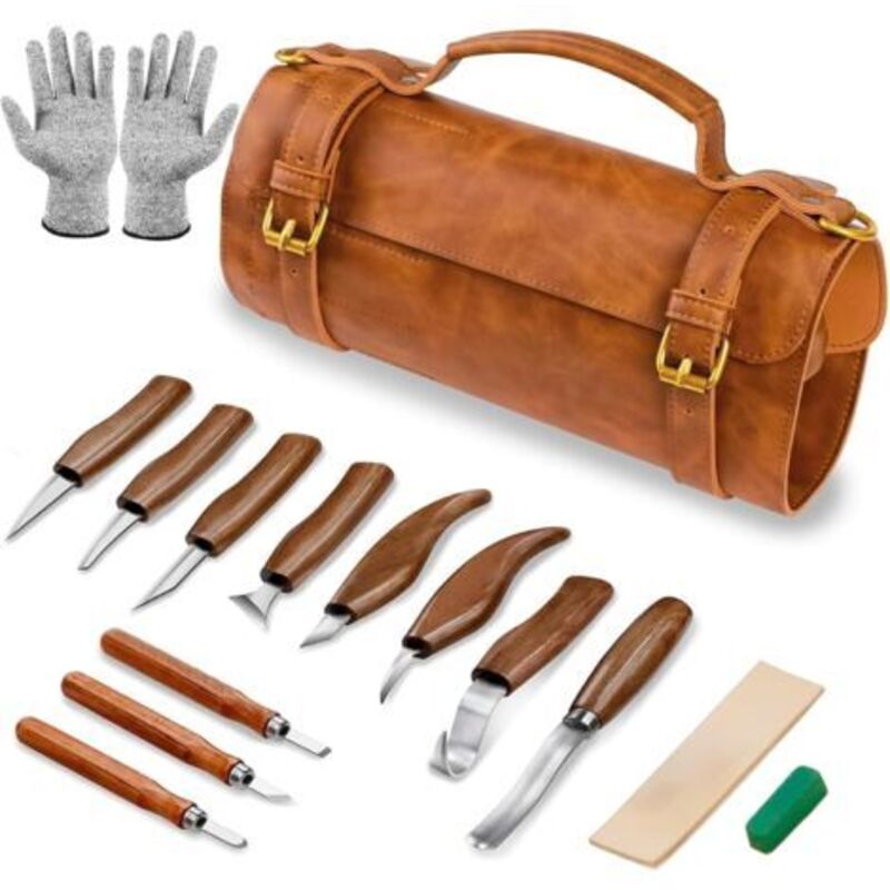 Sculpture Bois Kit, 15 in 1 Pack Outils Deluxe contiennent des Couteaux à Tailler, Gouge a Bois, Gants, Pâte à Polir, XU,un Sac en Cuir, pour