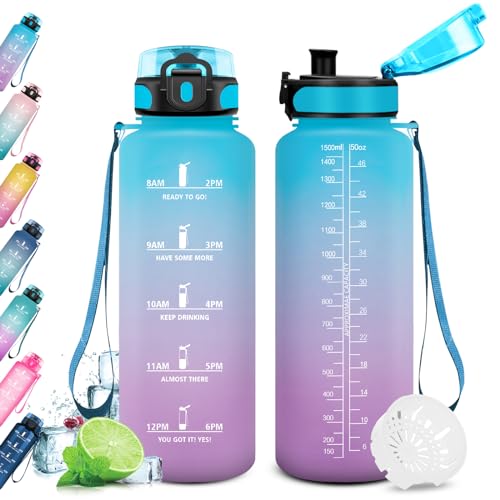 Grsta Gourde, 1.5L Gourde Sport, sans BPA, Bouteille d'eau, Graduée pour 1 Journee, Filtre et Marqueur de Temps, Motivation pour la randonnée, l'école - Bleu violet