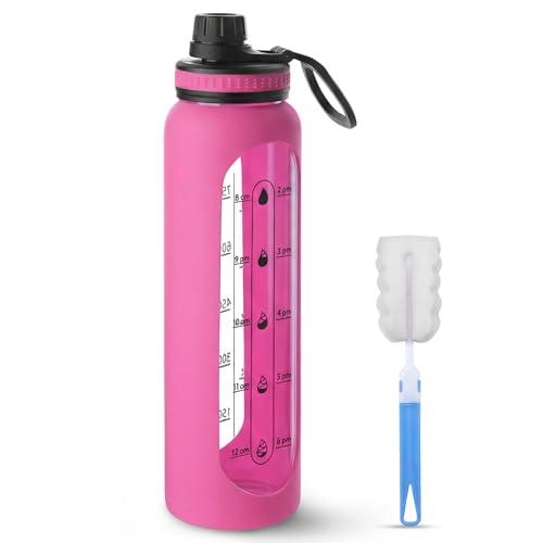 Wessper Bouteille d’eau 1L de Motivation en verre avec temps horaire, Sans BPA, Gourde en verre hermétique 1000 ml avec couvercle en bambou réutilisable avec housse en silicone – Rose