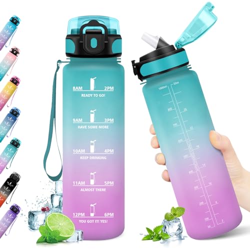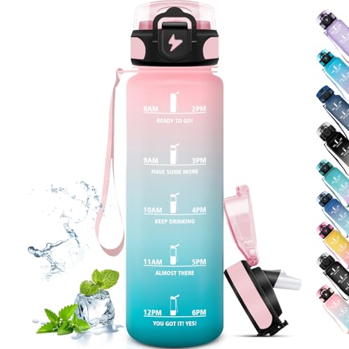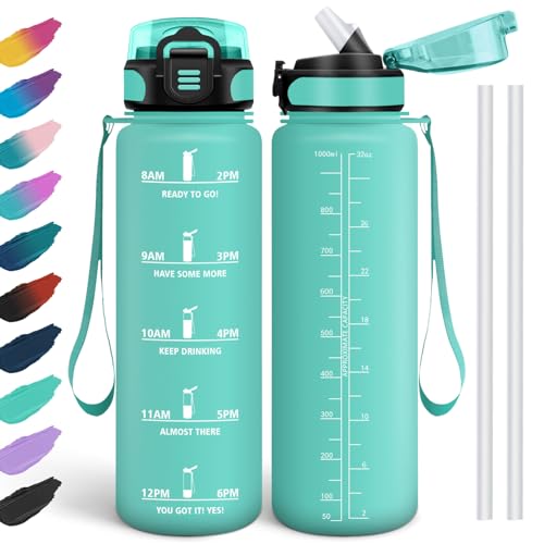 Grsta Gourde 1l, Sport, avec Paille Anti-Fuite, Reutilisable avec Slogan de Motivation, pour Boire Plus, Facile à Transporter, pour Fitness, Cyclisme, Extérieur, Bleu-Vert