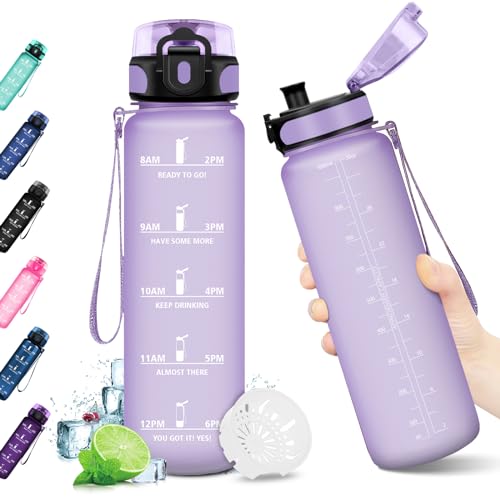 Grsta Gourde 1l, Gourde Sport avec Filtre, Gourde Motivation avec Marqueur de Temps, Gourdes de Camping et Randonnée anti Fuite, Gourde Adulte pour Running, Vélo, Musculation, Violet