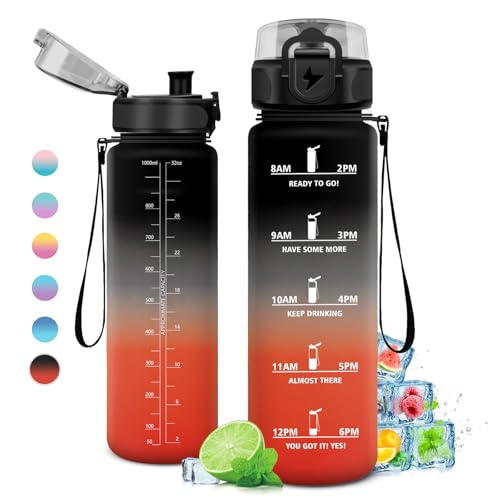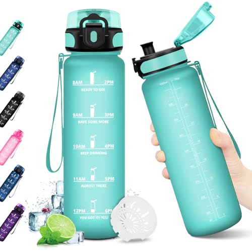 Gourde 1L, Gourde Sport, Étanche et Réutilisable, Bouteille d'eau 1 Litre avec Marqueur de Temps et Filtre, Bouteille pour Adulte, l'école, Cyclisme, Voyage, Camping, Fitness, Yoga, Bureau, Gym