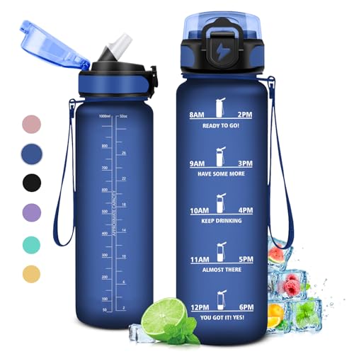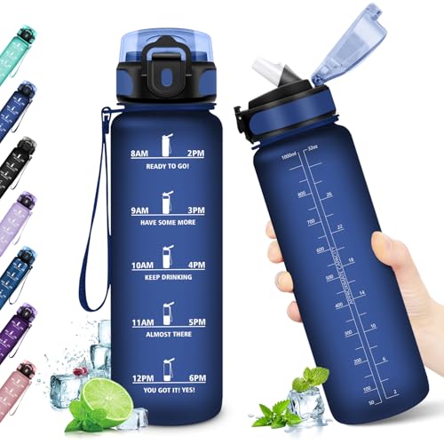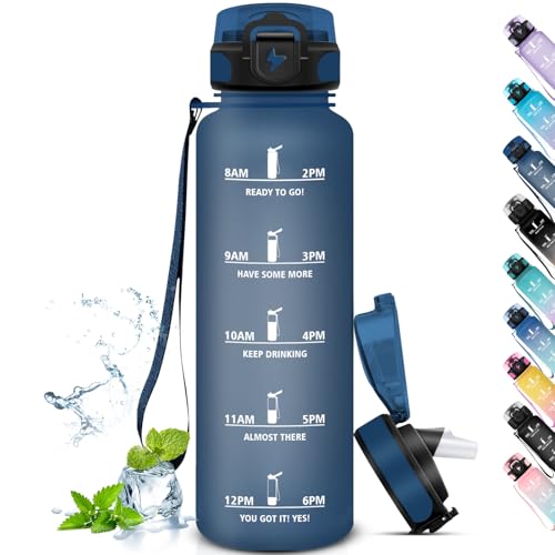 Grsta Gourde 1l, Gourde Sport Anti-Fuite, Gourde Paille pour Musculation, Gourde Graduée avec Marqueur de Temps, Gourde eau Motivation, Facile à Nettoyer, pour Running, Camping, Randonnée, Navibleu