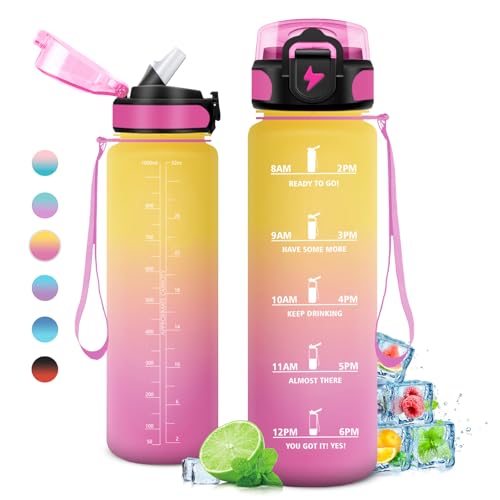 Grsta Gourde Sport Anti-Fuite, avec Paille Adulte, Facile à Transporter, Randonnée avec Marqueur de Temps, Bouteille Plastique 1l pour Sport, Gym, Bureau, Jaune-Rose