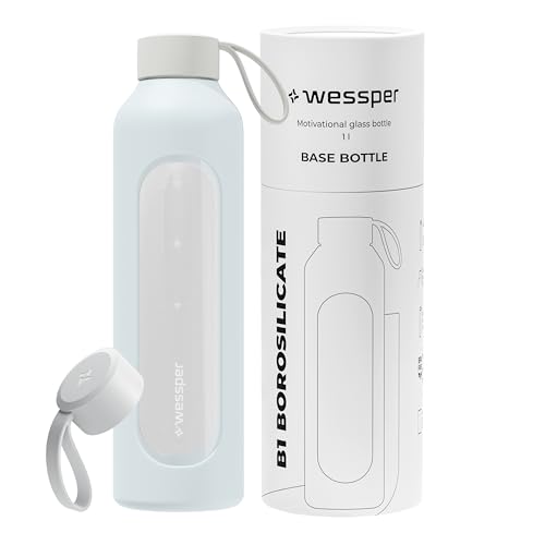 Wessper Bouteille d’eau 1L de Motivation en verre avec temps horaire, Sans BPA & Bouteille d’eau 1L de Motivation en verre avec temps horaire, Sans BPA, Gourde en verre hermétique 1000 ml