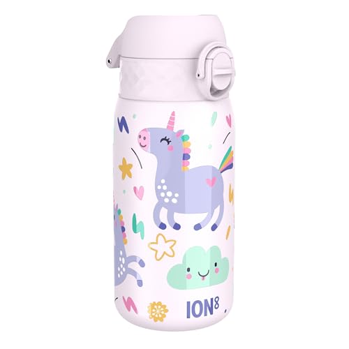 Ion8 Gourde Isotherme Enfant, Inox, 320ml, Anti-Fuite, Facile à Ouvrir, Verrouillage Sécurisé, Lavable au Lave-Vaisselle, Poignée de Transport, Durable, Acier Inoxydable, Licornes