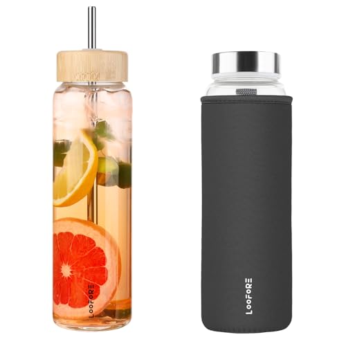 LOOFORE Gourde en Verre 1 Litre avec Paille, Gourde Verre 1L avec 2 Couvercles (Bambou et Acier Inoxydable), sans BPA, étanche et Réutilisable, pour Maison, Voyages, Sport, Yoga, Gym, Lot de 1