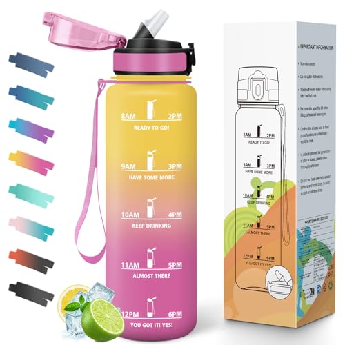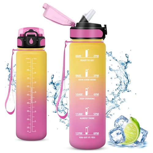 Grsta Gourde Sport Anti-Fuite, avec Paille Adulte, Facile à Transporter, Randonnée avec Marqueur de Temps, Bouteille Plastique 1l pour Sport, Gym, Bureau, Jaune-Rose