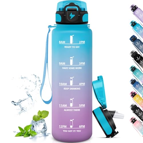 Gourde 1l, Gourde Sport avec Paille, Gourde Motivation avec Marqueur de Temps, Gourde Reutilisable anti Fuite, Gourde Randonnée, Facile à Nettoyer, Bouteille d'eau pour Gym, Fitness, Yoga, Bleu-Violet
