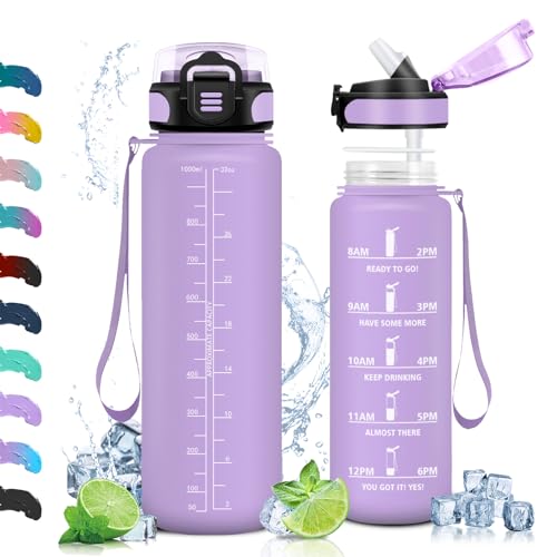 Gourde Sport 1L Anti-Fuite avec Paille - Graduée avec Marqueur de Temps, Motivation, Facile à Nettoyer pour Musculation, Extérieur, Camping, Randonnée, Yoga - Violet