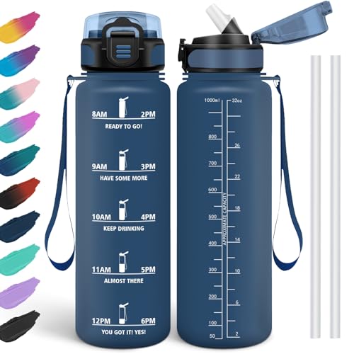 Grsta Gourde 1l, Gourde Sport Anti-Fuite, Gourde Paille pour Musculation, Gourde Graduée avec Marqueur de Temps, Gourde eau Motivation, Facile à Nettoyer, pour Running, Camping, Randonnée, Navibleu