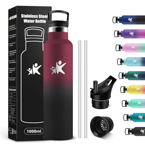 KollyKolla Gourde Isotherme 1L, Gourde Inox avec en Paille, Bouteille Isotherme sans BPA, Anti-Fuite, Réutilisable Gourdes pour Enfant, Adultes, Sport, Gym, Voyage, École, Cyclisme - 2 Couvercles