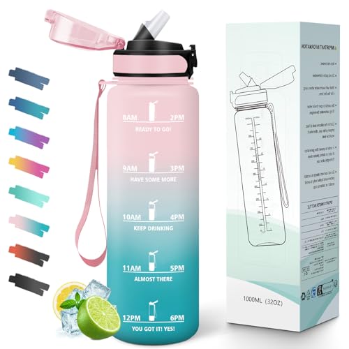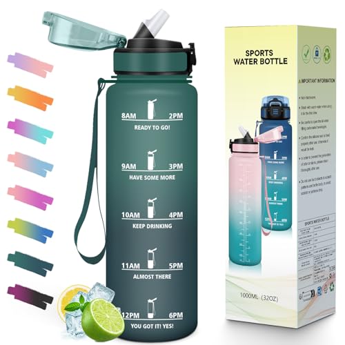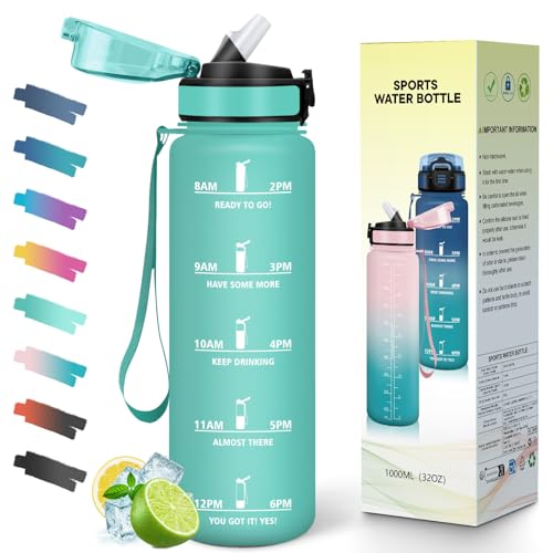 Grsta Gourde 1l, Sport, avec Paille Anti-Fuite, Reutilisable avec Slogan de Motivation, pour Boire Plus, Facile à Transporter, pour Fitness, Cyclisme, Extérieur, Bleu-Vert