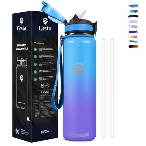 Grsta gourde Isotherme 1L Paille sans BPA Bouteille sous Vide à Double Paroi Anti-Fuite Métal Sport, Camping, Gym