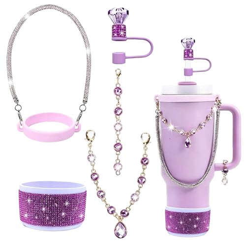 GZWY Lot de 5 accessoires en strass pour Stanley Cup 40/30 oz, couvercle de paille scintillante, bande de poignée de gourde, pendentif à paillettes, coque en silicone, accessoires bling pour gobelet