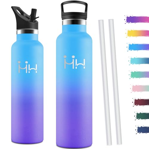 Motswedi Gourde Isotherme 1l, avec Paille, Bouteille Isotherme, Poignée de Transport, Thermos 1l, Anti-Fuite, Gourde Inox, Réutilisable, Thermos pour Sport, Voyage, Camping, Bleu Ciel & Violet