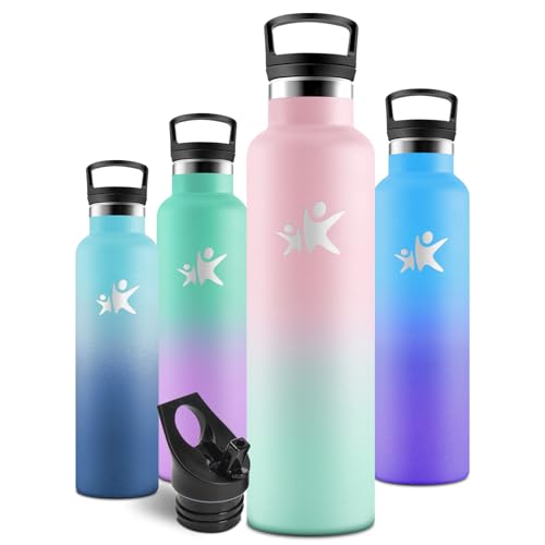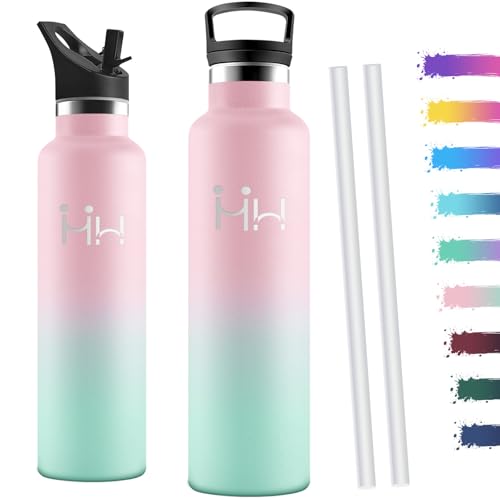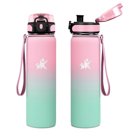 Vikaster Bouteille acier inoxydable - Thermos 1l, Gourde Avec Paille, Gourdes Sans BPA, Gourde Enfant & Adulte pour Sport, école, Bureau, Gym, Voyage, Vert - Rose