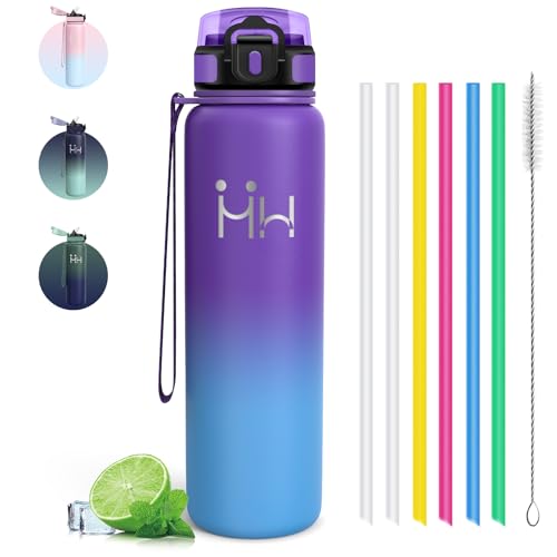 Motswedi Gourde Isotherme 1l, avec Paille, Bouteille Isotherme, Anti-Fuite, Thermos, Poignée de Transport, Gourde Inox, Réutilisable, Thermos 1l pour Voyage, Camping, Sport, Gym, Bleu Ciel & Violet