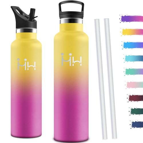 Motswedi Gourde Isotherme 1l, avec Paille, Bouteille Isotherme, Poignée de Transport, Thermos 1l, Anti-Fuite, Gourde Inox, Réutilisable, Thermos pour Sport, Voyage, Camping, Jaune & Rose