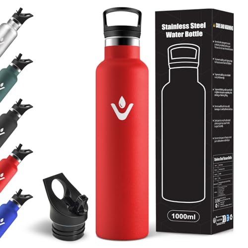 Vikaster Bouteille acier inoxydable - Thermos 1l, 24h froid & 12h chaud, Gourdes Sans BPA, Gourde Enfant & Adulte pour Sport, école, Bureau, Gym, Voyage, Noir et Bordeaux