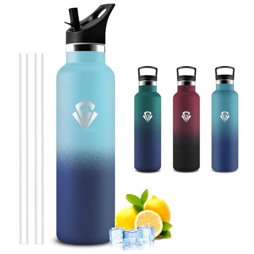 Vikaster Bouteille d'eau isotherme - Thermos 1l, Gourde Avec Paille, Gourdes Sans BPA, Gourde Enfant & Adulte pour Sport, école, Bureau, Gym, Voyage, Bleu Clair - Bleu Foncé