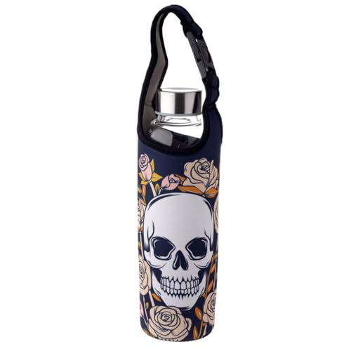 Puckator Bouteille d'eau en Verre (Gourde) 500ml Skulls & Roses & Manchon à Lanière de Transport - Crâne
