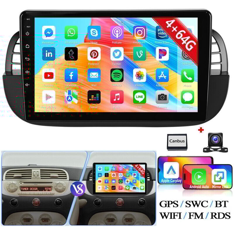 Autoradio Android 14 9 pouces avec CarPlay pour Fiat 500 (2007-2015), radio FM RDS, navigation GPS, Wi-Fi et Bluetooth - 4+64G DAB+ CAM