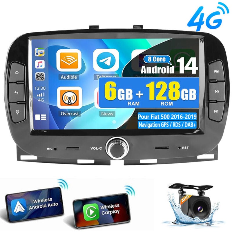 Autoradio Android 14 6Go+128Go 4G 8-Cœurs pour Fiat 500 (2016-2019) - Apple CarPlay, DAB+ en Option, GPS, Wi-Fi - 6+128G CAM