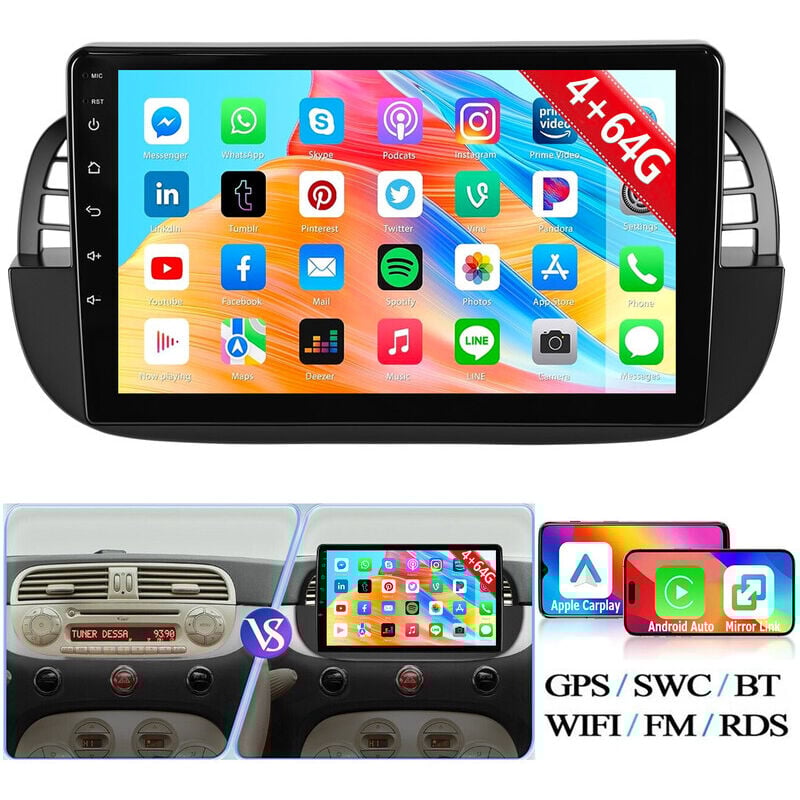 Autoradio pour Fiat 500 (2007-2015) : Android 15, Apple CarPlay, GPS, Bluetooth, Wi-Fi, RDS, DSP, 4 Go + 64 Go de RAM - 4+64G