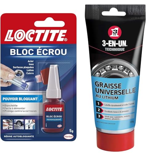 LOCTITE Colle "Bloc Écrou" - Résine autobloquante pour éviter le desserage par vibration de boulons & 3-EN-UN Technique • Graisse Universelle au Lithium • Tube • Forte adhérence