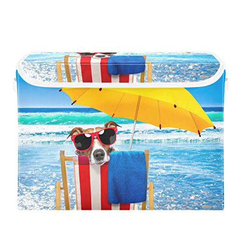 Bacs de rangement avec couvercle, motif animal chien, été, mer, plage, jouets, chambre d'enfant, 41,9 x 32 x 30 cm, grand cube de rangement pliable pour maison, bureau, placard, étagère