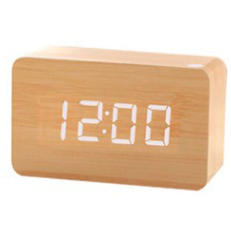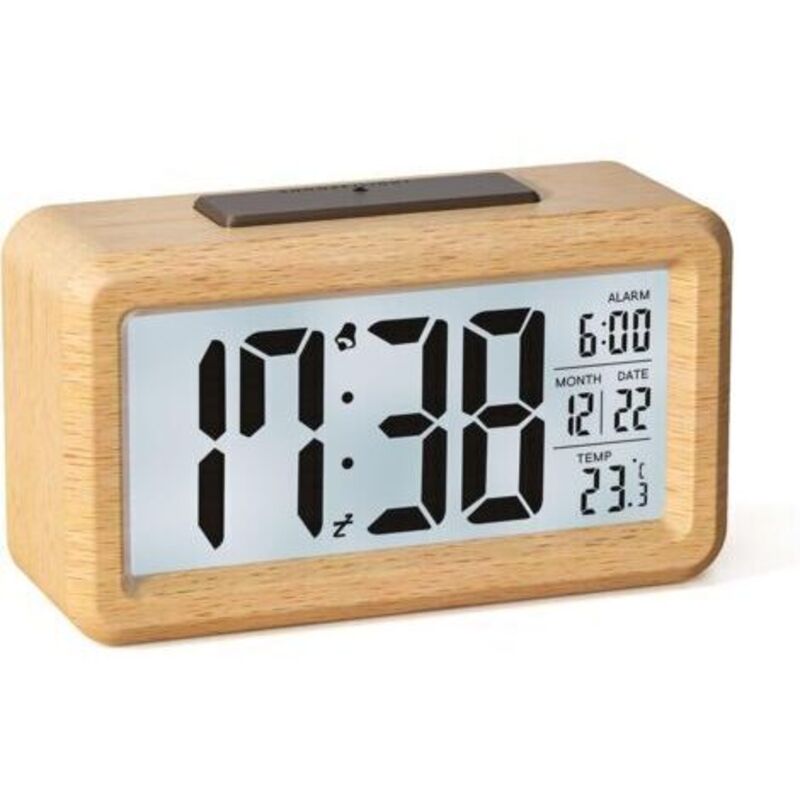 Reveil Numerique, Reveil Matin a Piles en Bois avec Grand écran LCD, Horloge Numérique avec Rétroéclairage, Date, Température, Capteur de Lumière