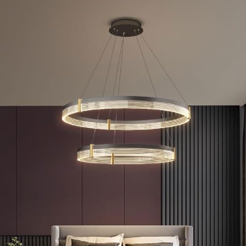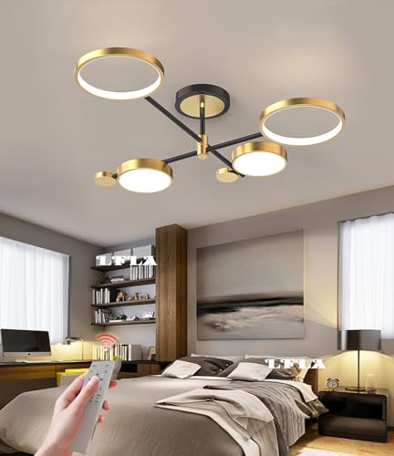 LFLA Plafonnier LED Dimmable Grand Salon Luminaire Moderne Noir/Or Métal Acrylique Anneaux Design Chambre à coucher Lampe avec télécommande Salle à manger Éclairage (Or, 4 Flamme-75cm-48W)