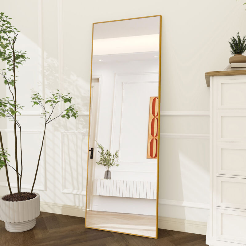 Miroir intégral, 160 x 50 cm, miroir rectangulaire sur pied, grand miroir à poser au sol, cadre en alliage d’aluminium, verre trempé, pour chambre, salon, dressing, doré clair