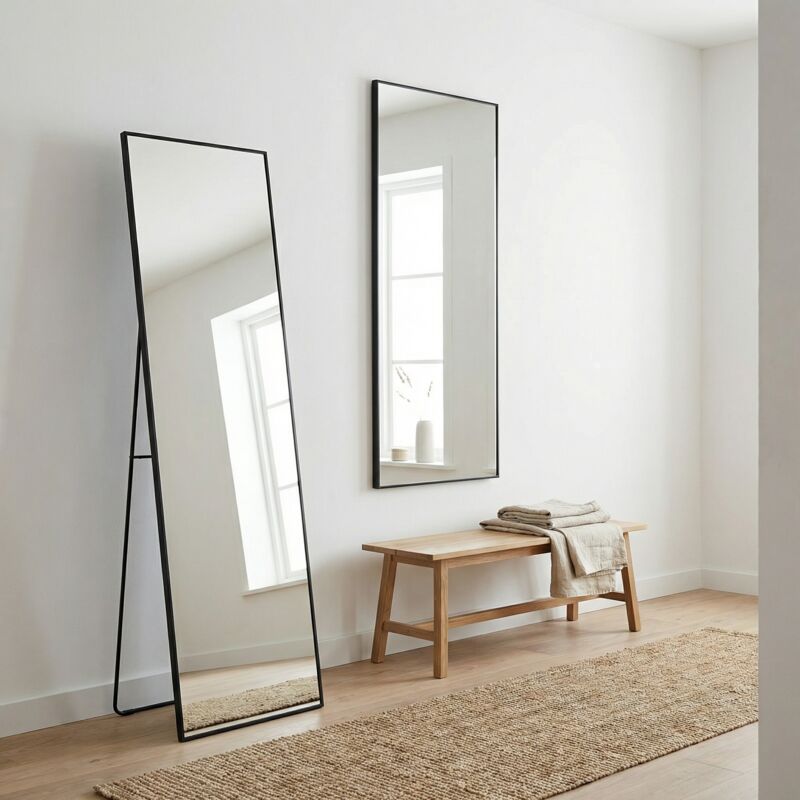 Miroir sur Pied 162x53 cm – Cadre en aluminium noir minimaliste – Grand miroir mural à poser ou suspendre – Pour salon et chambre