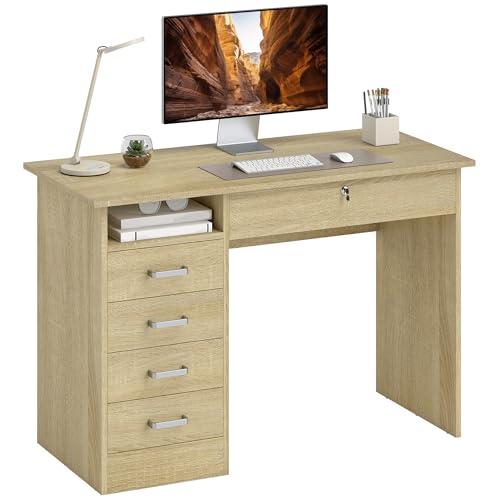 HOMCOM Bureau Informatique Table d'ordinateur avec Grand Plateau, 5 tiroirs, 1 Compartiment Ouvert, tiroir verrouillable, Moderne 110 x 50 x 76 cm, chêne