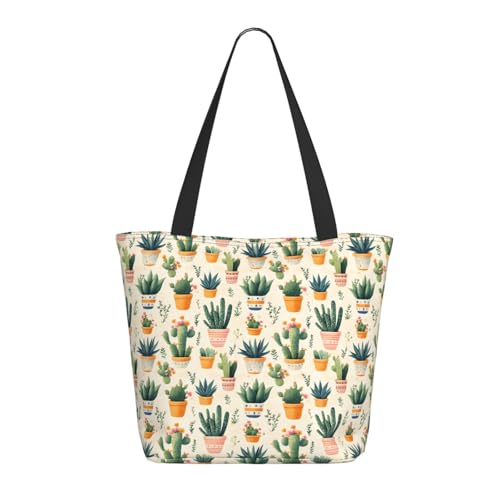 Nevjipu Grand sac fourre-tout pour femme – Imprimé cactus en pot, léger, réutilisable, pliable – Sacs de courses confortables pour les courses, le travail, les voyages, la plage avec poignées