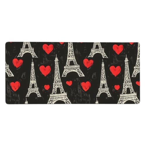 Grand tapis de souris de jeu - Base en caoutchouc imprimé cœur Tour Eiffel - Tapis de bureau avec bords cousus - Tapis de souris pour ordinateur portable, clavier PC - 30,5 x 80,5 cm