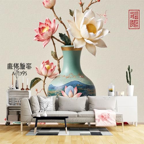 Papier peint mural de taille personnalisée, vase de lotus élégant, art floral, design décoratif d'inspiration orientale, tissu mural auto-adhésif (pas de PVC), grand papier peint amovible pour salon
