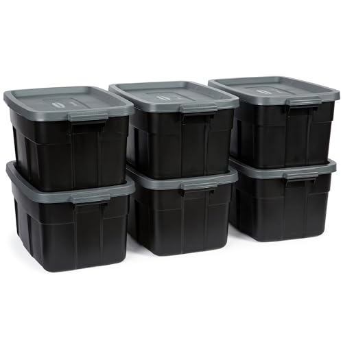 Rubbermaid Lot de 6 bacs de rangement robustes en plastique noir avec couvercles pour le rangement, empilables, grande capacité, durables, polyvalents, 48 litres (43,6 l, noir et gris)