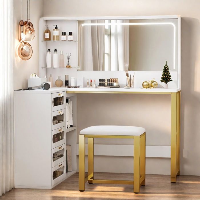 Coiffeuse Grande avec Miroir et Tabouret LED Réglable Prise et Port USB 7 Tiroirs de Rangement Blanc