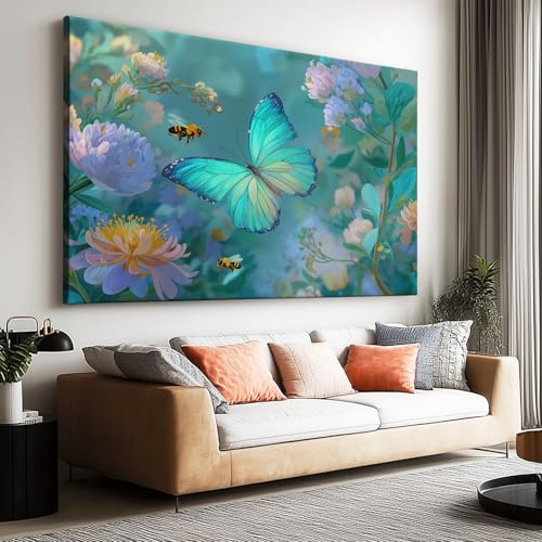 Cadre en Bois Papillons Colorés Floral Abeilles Impression sur Toile Moderne Mural 120 x 80 cm Cyan sur Toile Grande Tableau Decoration Murale Salon Chambre prêt à accrocher 1 pièce